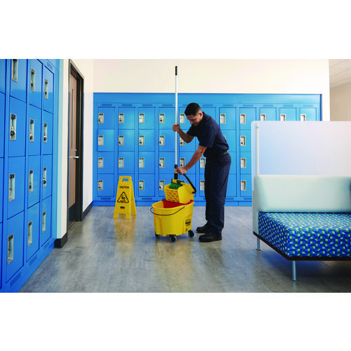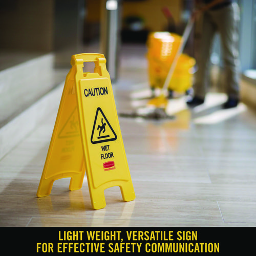 The Rubbermaid Commercial 2-Sided Floor Safety Sign with “Caution Wet Floor” Imprint is lightweight and versatile. The caution sign makes a heavy statement about safety. The 25-inch model is suitable for use in narrow areas. The folding design allows for convenient storage or transport on a janitor cart. Each of the wet floor signs has caution warning messages imprinted in easy-to-read lettering for effective communication. The warning sign features durable plastic construction that will not rust, corrode, or fade. The 2-sided, bright yellow design meets OSHA requirements. The flexible locking-style hanger makes the sign stationary and visible from all directions. Measures 12″ deep when open.