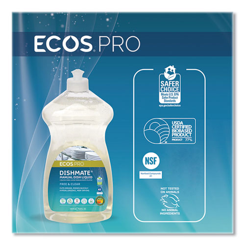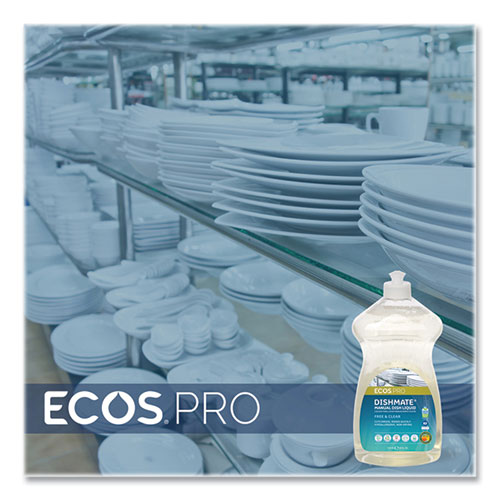 This highly effective ECOS PRO Dishmate manual dishwashing liquid cleans and cuts grease without drying out skin. The unique formulation leaves less residue on dishes for a quicker rinse time and reduction in water usage. The hypoallergenic, pH-balanced formula is made using sustainable, plant-derived surfactants. The product is free of dyes and is gray water and septic safe. Not tested on animals.