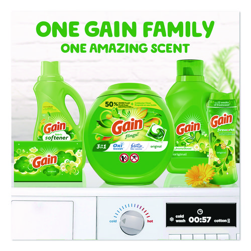 Easy-to-use Gain® flings provide a unit-dose of laundry detergent with 50% more* Gain® Original scent to your clothes. A pleasant scent combines with Oxi boost to fight stains while Febreze® eliminates unpleasant odors. Complete detergent leaves clothes left wonderfully clean with an amazing scent. Designed for Standard and HE machines.