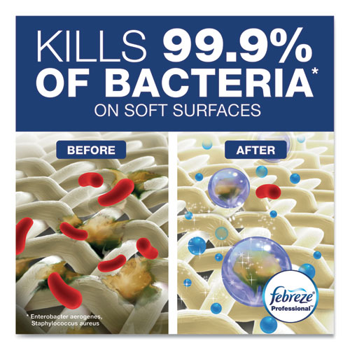 Soft surfaces that can’t be washed, such as mattresses and upholstered furniture, are harbors for harmful bacteria, mold and mildew. Febreze Professional Sanitizing Fabric Refresher gives you the same freshening power of Febreze plus the soft surface sanitization your environment needs. Proprietary technology goes to the source of odors and fights them. A light, fresh scent is left behind to leave the treated area smelling fresh and clean. Safe for virtually all fabrics. Spray soft surface until fully wet and the soft surface must remain wet for five minutes.