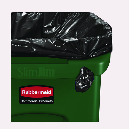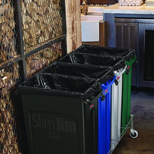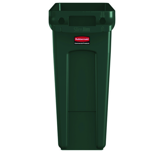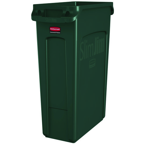 The Rubbermaid Commercial Products Vented Slim Jim Recycling Can Waste Receptacle, 23 Gallon, is crafted to make waste management compliance easier and reduce strain on workers. Constructed of high quality, commercial-grade materials, these trash cans feature four venting channels that make removing garbage bags up to 80% easier than traditional straight wall receptacles. By allowing air to flow into the can, liners can be pulled more easily from the recycling bin which reduces strain on staff and increases efficiency. Four bag cinches around the rib-strengthened reinforced rim create quick, knot-free liner changes. Sturdy handles and molded base grips make transporting and emptying contents more ergonomic while the step design prevents jamming when containers are nested. The Vented Slim Jim waste receptacle recycler is designed for superior durability and maximum efficiency.