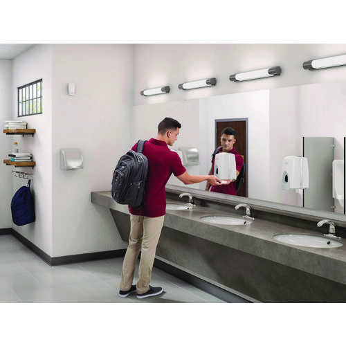 Discreet, decorative dispenser enhances nearly any public space: washrooms, restaurants, offices and more. Innovative unit runs on a hydrogen fuel cell; no batteries or plug-in electrical source required. Each refill is designed for continuous use operation for up to 60 days.
